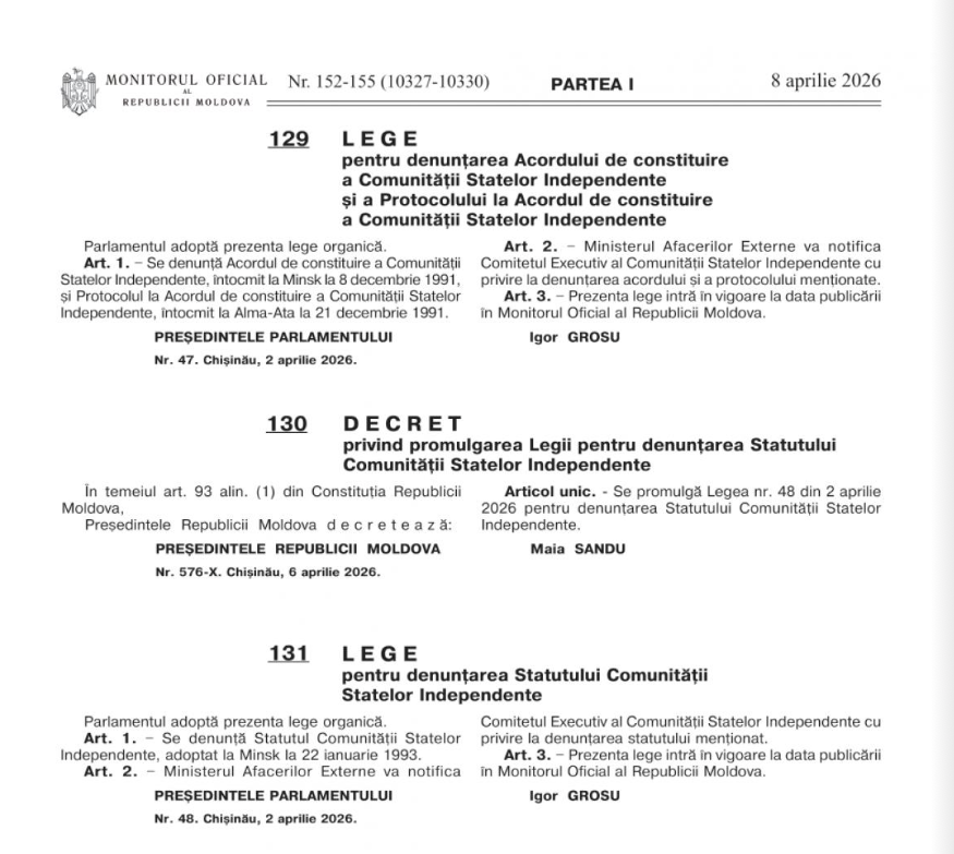 Maia Sandu has promulgated the decisions by the Republic of Moldova to denounce the Agreement on the Establishment, the related protocol, and the statute of the Commonwealth of Independent States. Authorities have published the acts in the Official Gazette and will notify CIS member states of the decision.