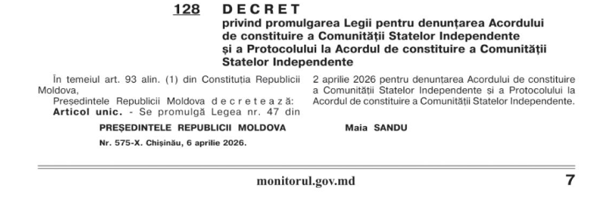 Denunciation of the CIS Statute, promulgated by Maia Sandu. The document has been published in the Official Gazette
