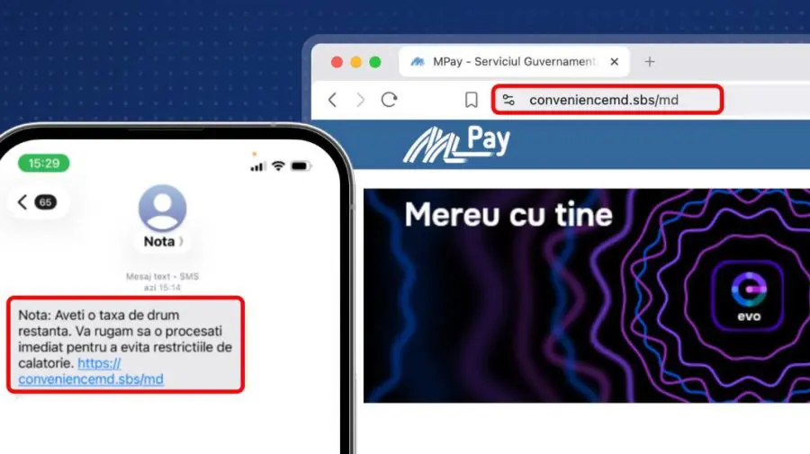 The Government of the Republic of Moldova warns about a fraud scheme that illegally uses the identity of MPay and EVO. Citizens who receive messages about an alleged “outstanding road tax” and are urged to access links such as conveniencemd.sbs/md should know that these do not belong to the Government and represent phishing attempts aimed at fraudulently collecting personal and banking data.