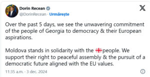 The Prime Minister of the Republic of Moldova, Dorin Recean, delivered a strong message of support to the people of Georgia, who are experiencing a period of intense pro-European protests. “Over the past five days, we have witnessed the unwavering commitment of Georgians to democracy and European aspirations. Moldova stands with the Georgian people, supporting their right to peaceful assemblies and a democratic future aligned with EU values,” he wrote on X (formerly Twitter).