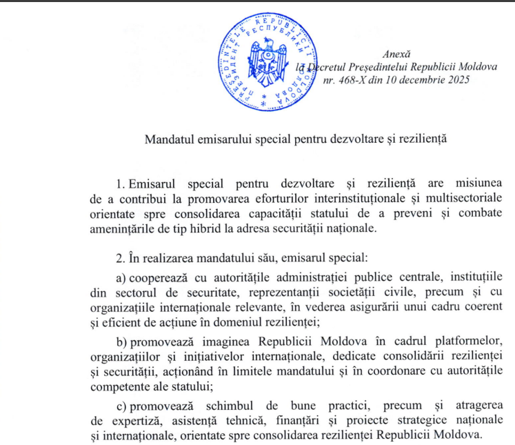 “The Special Envoy for Development and Resilience is responsible for supporting interinstitutional and multisectoral efforts aimed at enhancing the state’s capacity to prevent and counter hybrid threats to national security. The mandate also includes promoting the Republic of Moldova’s image on international platforms dedicated to resilience and security, as well as exchanging best practices with partner countries. Additionally, the Special Envoy will help mobilize the necessary support to strengthen the country’s institutional, economic, and social resilience,” the Presidency announced.