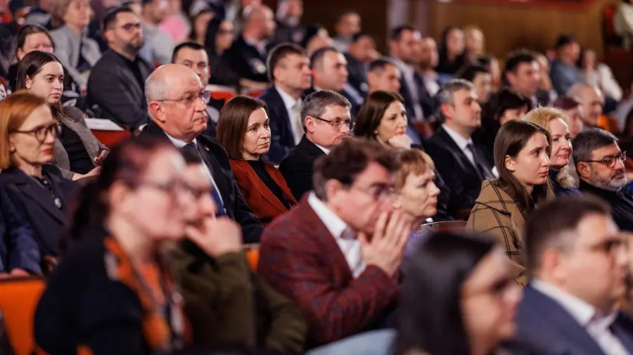 Images from the event show Parliament Speaker Igor Grosu, Prime Minister Alexandru Munteanu, and Minister of Culture Cristian Jardan alongside Maia Sandu.