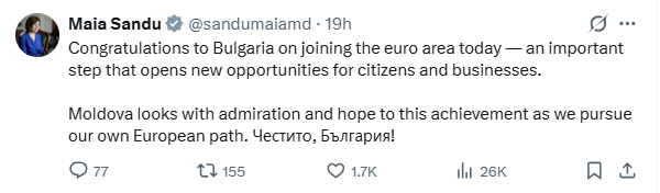 “Congratulations to Bulgaria on joining the euro area today, an important step that opens new opportunities for citizens and businesses. Moldova looks on with admiration and hope at this achievement as we continue on our own European path. Congratulations, Bulgaria,” Maia Sandu wrote on the X platform.