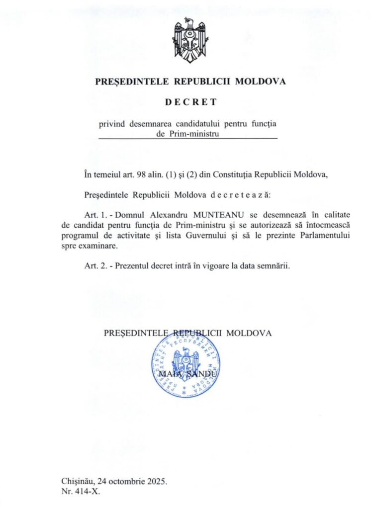 President Maia Sandu signed a decree today, October 24, appointing Alexandru Munteanu as the candidate for the position of Prime Minister of the Republic of Moldova.