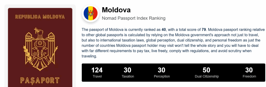 The Republic of Moldova ranks 40th in the Nomad Passport Index, with a total score of 79. The index evaluates Moldova’s passport by assessing the government’s approach to travel, international tax legislation, global perception, dual citizenship, and personal freedom.