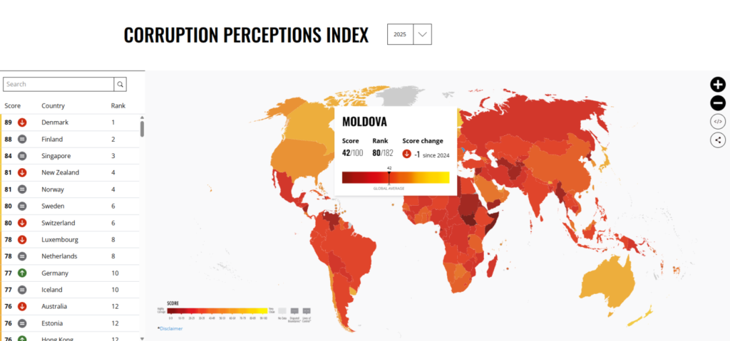 The Republic of Moldova ranks 80th globally with a score of 42 points in Transparency International’s 2025 Corruption Perceptions Index, which measures perceived levels of corruption in the public sector on a scale from 0 (highly corrupt) to 100 (very clean). The global average dropped to a historic low of 42 points, and most countries continue to struggle with corruption.