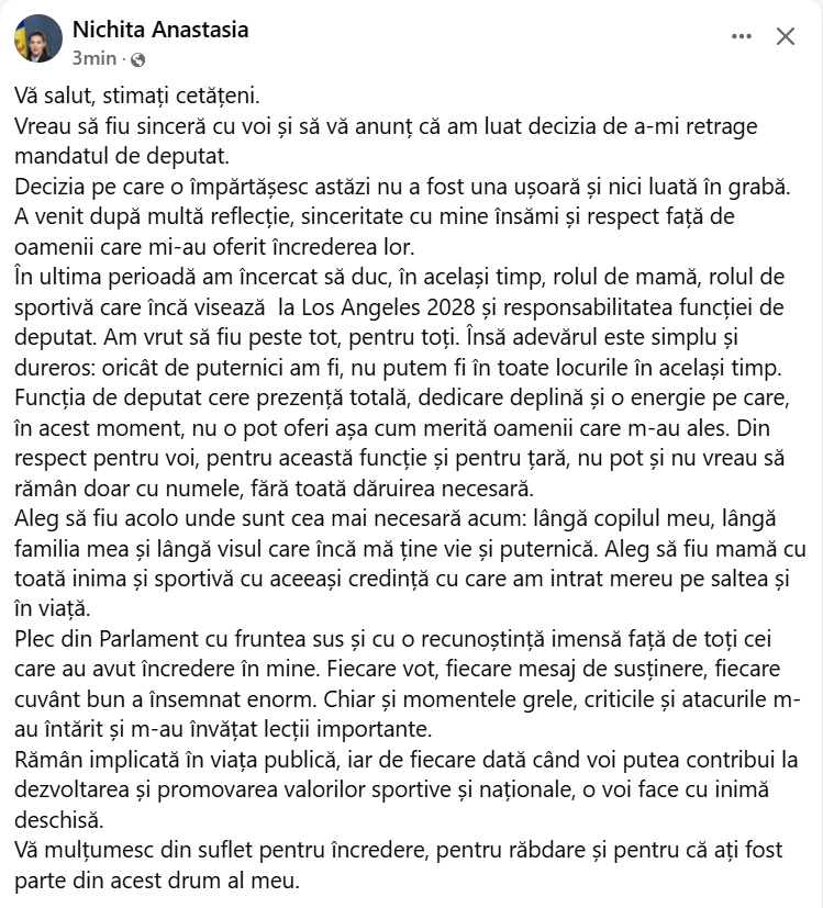 The PAS MP and Olympic wrestling silver medalist Anastasia Nichita announced on Monday morning, January 26, that she is stepping down from her parliamentary mandate because she cannot currently balance motherhood, her sports career, and legislative duties.