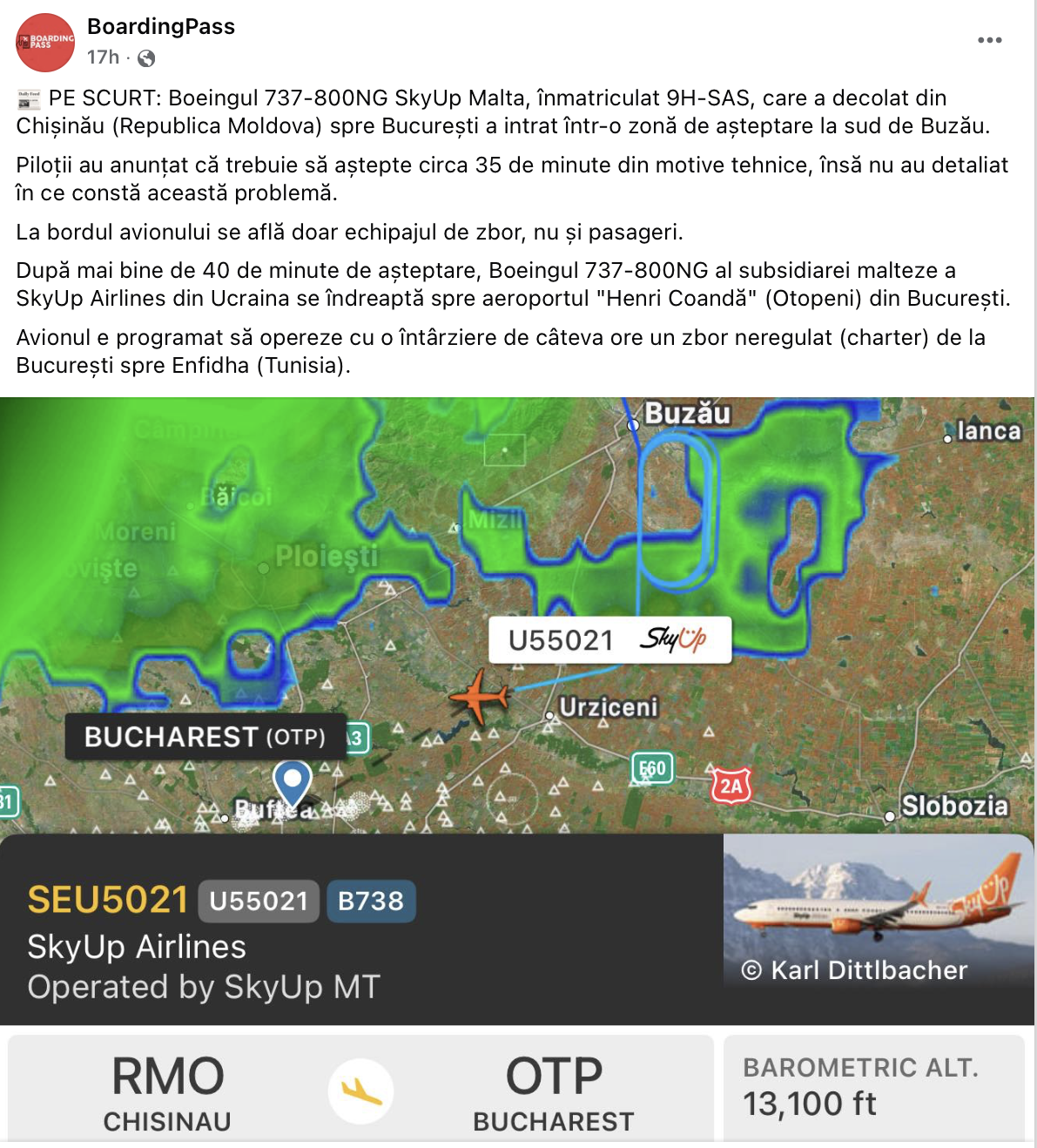 A SkyUp Airlines aircraft flying from Chisinau to Bucharest experienced a delay on Wednesday after circling for several minutes south of Buzau, Romania, according to BoardingPass.ro. The incident occurred while the plane was operating without passengers.
