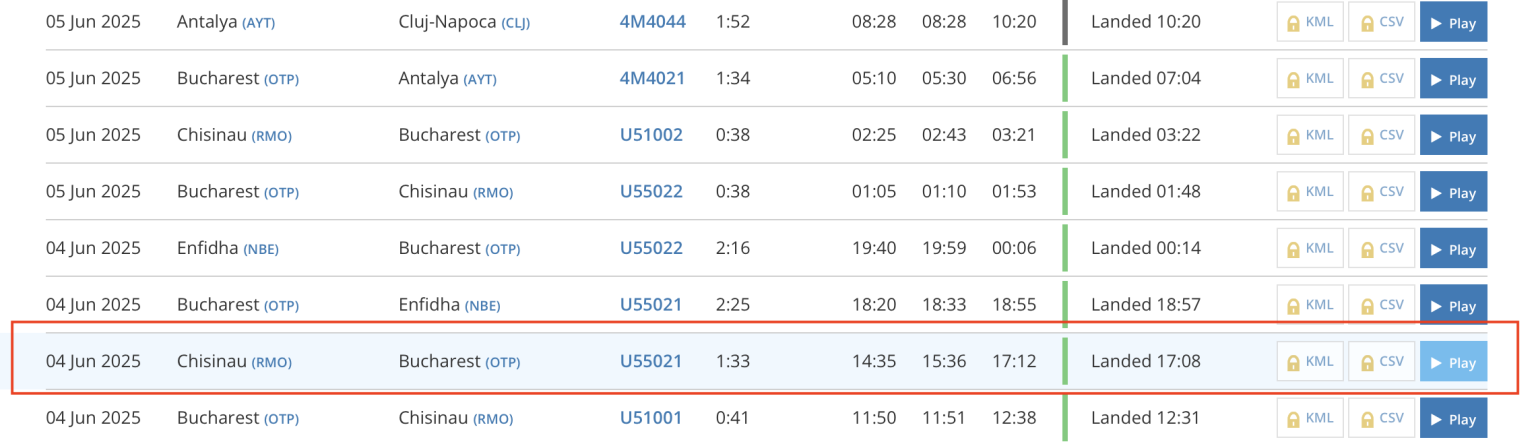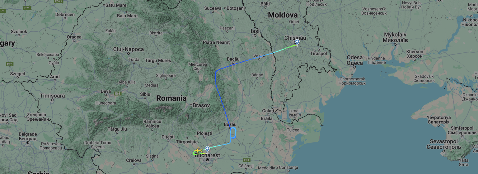 The aircraft took off at 14:35 from Moldova and landed in Bucharest at 17:08, as shown on FlightRadar24. The flight path indicates the aircraft performed multiple holding patterns near Buzau before continuing to its destination.