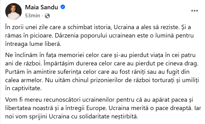 The leadership of the Republic of Moldova delivered messages marking four years since the start of the war in Ukraine. President Maia Sandu stated that the resilience of the Ukrainian people represents a light for the entire free world, while Parliament Speaker Igor Grosu said that for four years the neighboring country has fought with determination for freedom, for its country, and for its future.