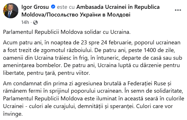 “We condemned from the very first day the brutal aggression of the Russian Federation, and we remain firm in our support for the Ukrainian people. As a sign of solidarity, the Parliament of the Republic of Moldova is illuminated this evening in the colors of Ukraine, colors of courage, dignity, and hope. Colors that will prevail,” Igor Grosu stated.