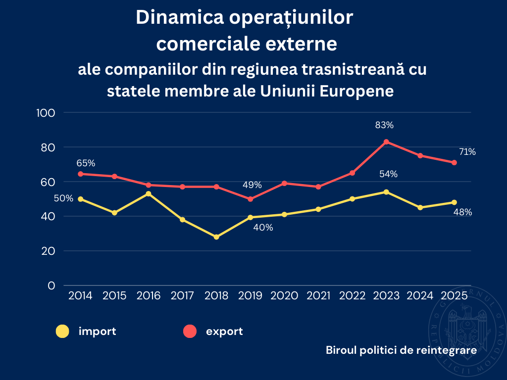 Exports from economic agents in the Transnistrian region to European Union (EU) member states accounted for 71 percent of total external deliveries in 2025, the Bureau for Reintegration Policies reported.